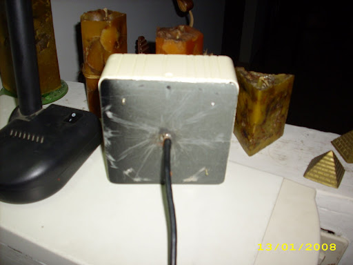 No lograba identificar como se alimentaba;:- [ No obstante, luego al darme cuenta que no había notado algo muy obvio que era la alimentación con un núcleo de aire de 50 Ohmnios resolví esta incógnita  ;D e hice la adaptación necesaria con el RG 58, la completé y la encajé en un cajetín de electricidad. El cajetín mide 116mm x 116mm.