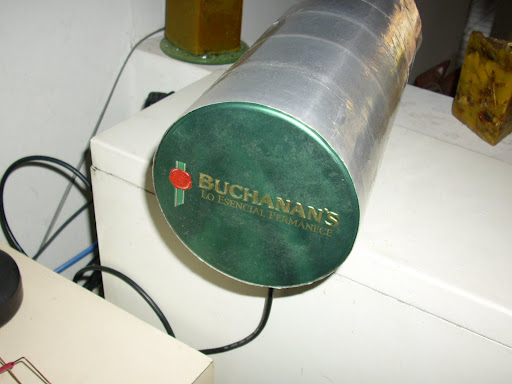 "Mi Cantena" .Envase elaborado por mí con lámina de acetato forrada con adhesivo de papel de aluminio. El reflector se hizo con la tapa de un envase de whisky escocés. (Próximamente post).